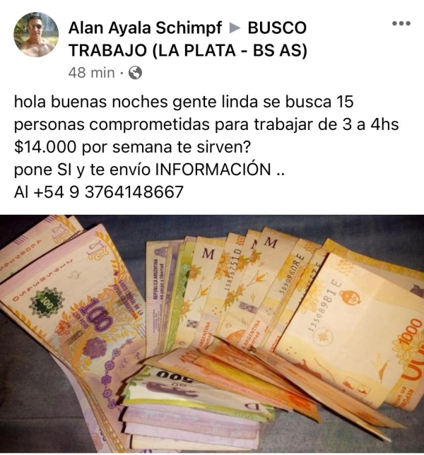 Según se puede ver en una captura de pantalla que compartió junto al texto, un hombre llamado Alan, dice que busca "15 personas comprometidas para trabajar", y luego da un número telefónico que no corresponde a la característica de La Plata, sino a la de Misiones.