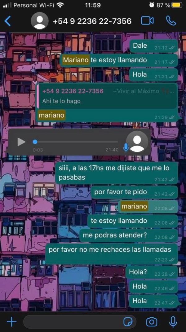 Luego de haberle depositado algo de plata a través de una transferencia bancaria, el joven volvió a comunicarse con el hombre, pero notó que dejó de responderle los mensajes y las llamadas. "Me podrás atender? Hola", se lee entre los mensajes que, desesperada, Agustina le mandaba a Sánchez.