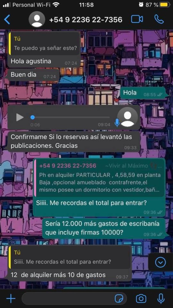 Según se puede ver en las capturas de pantalla que ella misma publicó para alertar al resto, un hombre identificado como Mariano Sánchez le ofreció un PH por $12.000 en calle 4 entre 58 y 59. Para poder ingresar, debía depositar ese dinero, sumado a otros $10.000 "de gastos".