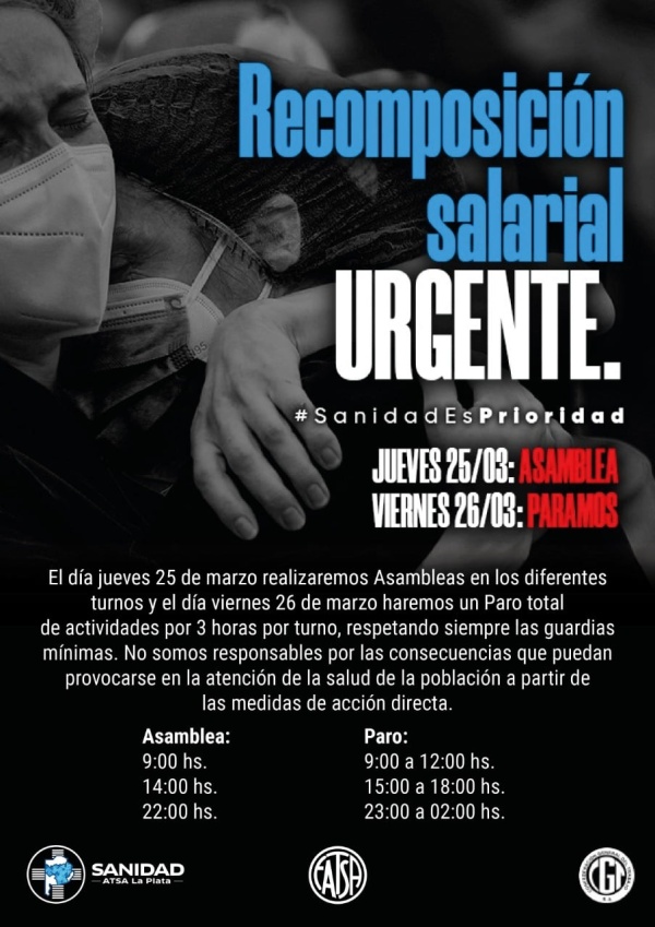 Desde ATSA La Plata, por su parte, emitieron un breve comunicado donde explicaron cómo se llevará a cabo. “Haremos un paro total de actividades por 3 horas por turno, respetando siempre las guardias mínimas”, sostuvieron.