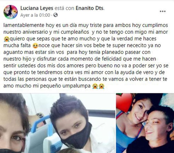 “Lamentablemente, hoy es un día muy triste para ambos. Hoy cumplimos nuestro aniversario y mi cumpleaños, y no te tengo conmigo, mi amor”, escribió la joven en su perfil de Facebook. “Quiero que sepas que te amo mucho y que, la verdad, me hacés mucha falta. No sé qué hacer sin vos, bebé, te super necesito. Ya no aguanto más estar sin vos.”, se lamentó.