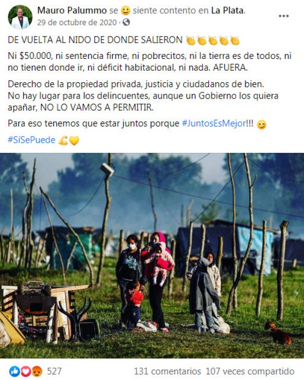 “De vuelta al nido de donde nacieron”, se titulaba aquel escrito. “Ni $5.000, ni sentencia forme, ni pobrecitos, ni la tierra es de todos, ni no tienen dónde ir, ni déficit habitacional, ni nada. AFUERA”, agregó Palummo. “No hay lugar para los delincuentes”, siguió Palummo aquel 29 de octubre en su cuenta de Facebook.