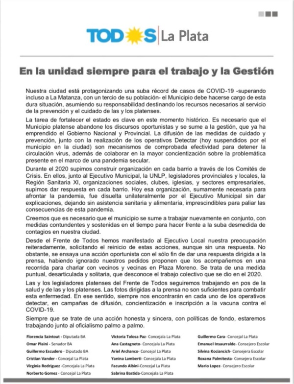 "Nuestra ciudad está protagonizando una suba récord de casos de COVID-19 -superando incluso a La Matanza, con un tercio de su población-", comienza el comunicado del Frente. Luego, continúa diciendo que "es necesario que el Municipio platense abandone los discursos oportunistas y se sume a la gestión, que ya ha emprendido el Gobierno Nacional y Provincial. La difusión de las medidas de cuidado y prevención, junto con la realización de los operativos Detectar (hoy suspendidos por el municipio en la ciudad) son mecanismos de comprobada efectividad para detener la circulación virus, además de colaborar en la mayor concientización sobre la problemática presente en el marco de una pandemia secular".