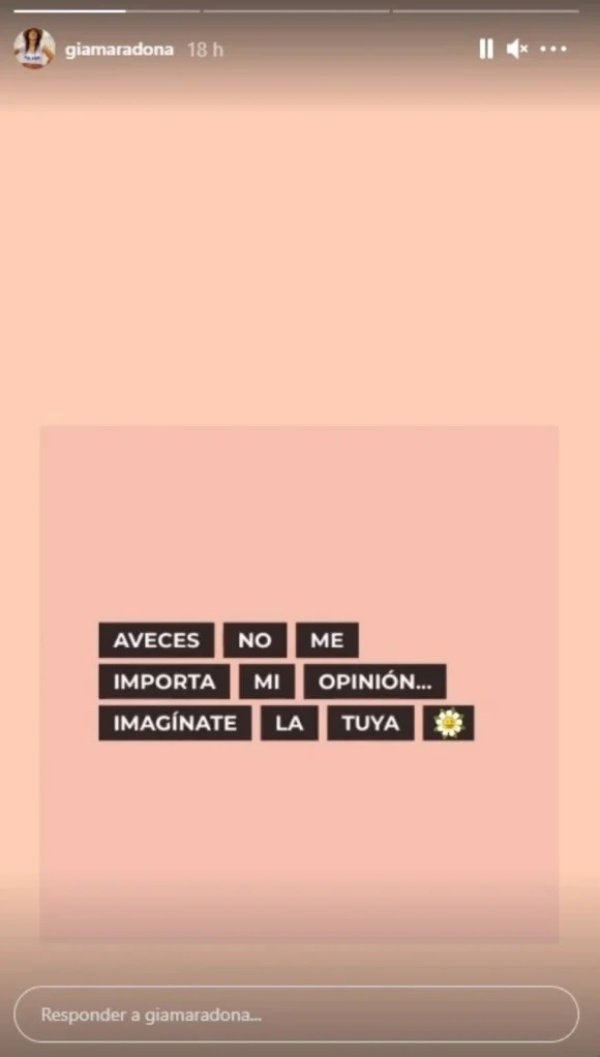 "A veces no me importa mi opinión... Imaginate la tuya", escribió en las stories de Instagram, filosa en medio de los cuestionamientos que recibe por su noviazgo con el ex de Jimena Barón y ¿examiga?