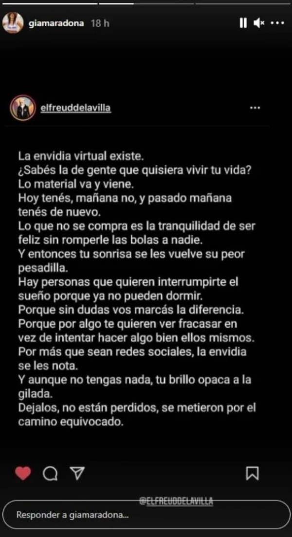 Pero no fue todo. También la diseñadora posteó en la red social un picante texto, que parecería ir en línea con el momento que vive. “La envidia virtual existe. ¿Sabés la de gente que quisiera vivir tu vida? (…) Lo que no se compa es la tranquilidad de ser feliz sin romperle las bolas a nadie (…) Por más que sean redes sociales, la envidia se les nota. Y aunque no tengas nada, tu brillo opaca a la gilada. Dejalos, no están perdidos, se metieron por el camino equivocado”, puso Gianinna Maradona, mientras disfruta del sur con Daniel Osvaldo, tras blanquear su romance.