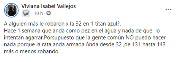 ¿"A alguien más le robaron x la 32 en una titán azul? Hace 1 semana que anda como pez en el agua y nada de que lo intentan agarrar. Porsupuesto que la gente común NO puede hacer nada porque la rata anda armada. Anda desde 32 ,de 131 hasta 143 más o menos robando", expresó en la publicación.