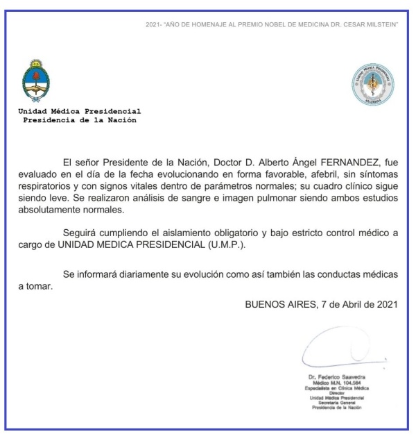 Fernández "seguirá cumpliendo el aislamiento obligatorio y bajo estricto control médico a cargo de la Unidad Médica Presidencial", refirió el parte, y añadió que "se informará diariamente su evolución como así también las conductas médicas a tomar".