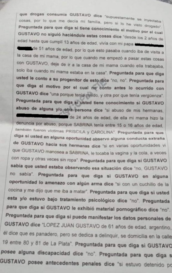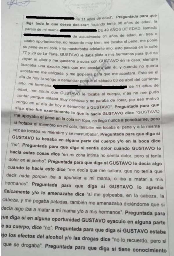 “En varias oportunidades vi que Gustavo manoseaba a Sabrina, le tocaba la vagina y la cola, a veces con ropa y otras veces sin ropa”, sigue otro extracto del testimonio. La denuncia fue formulada en la DDI de La Plata.
