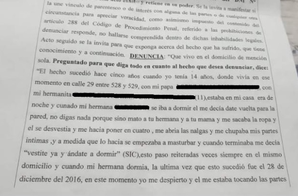 De acuerdo a la denuncia a la que accedió LAPLATA1.com, uno de los hechos ocurrió en 29 entre 528 y 529. “Cuando mi hermanita se iba a dormir, él me decía date vuelta para la pared, no digas nada porque mato a tu hermana y a tu mamá. Me sacaba la ropa y él se desvestía y me hacía poner en cuatro. Me abría las nalgas y me chupaba las partes íntimas”, dice crudamente el relato de la víctima.