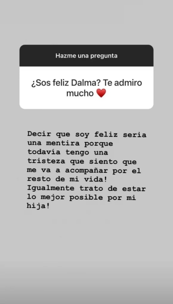 Pero en esta oportunidad, la joven se sometió a las consultas de los usuarios que la siguen en Instagram y no dudó en abrir su corazón y sincerarse sobre sus sentimientos: “¿Sos feliz, Dalma? Te admiro mucho”, fue una de las preguntas. A lo que ella respondió: “Decir que soy feliz sería mentira porque todavía tengo una tristeza que siento que me va a acompañar por el resto de mi vida”.