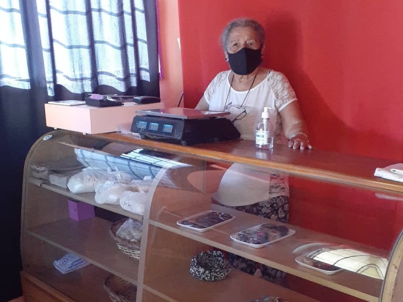 La abuela Matilde tenía una idea y la llevó a cabo, cuando "la edad es lo de menos". Unos pancitos, bizcochos, facturas, en la mesada que tiene una balanza y su frasco de alcohol en gel sobre la misma.