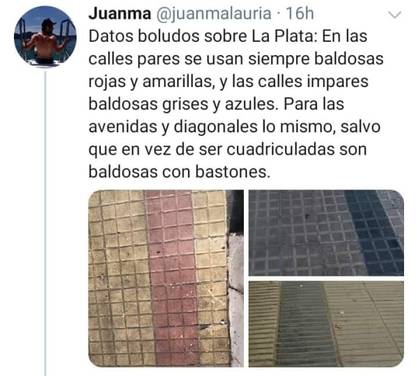 Según el usuario @juanmalauria y de acuerdo las tres fotos que adjuntó en su mensaje en la red social del pajarito, en La Plata "las calles pares usan siempre baldosas rojas y amarillas, y las calles impares, baldosas grises y azules".