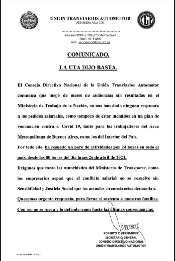 La decisión de adoptar la medida de fuerza fue anunciada por la UTA a través de un comunicado de prensa firmado por su titular, Roberto Fernández, frente a la falta de avances en las negociaciones salariales.
