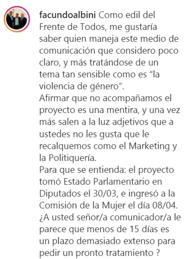 El concejal Facundo Albini decidió hacer visible este malestar y respondió en la propia cuenta de Instagram del Concejo Deliberante. En este caso, hizo foco en un proyecto vinculado a la violencia de género.