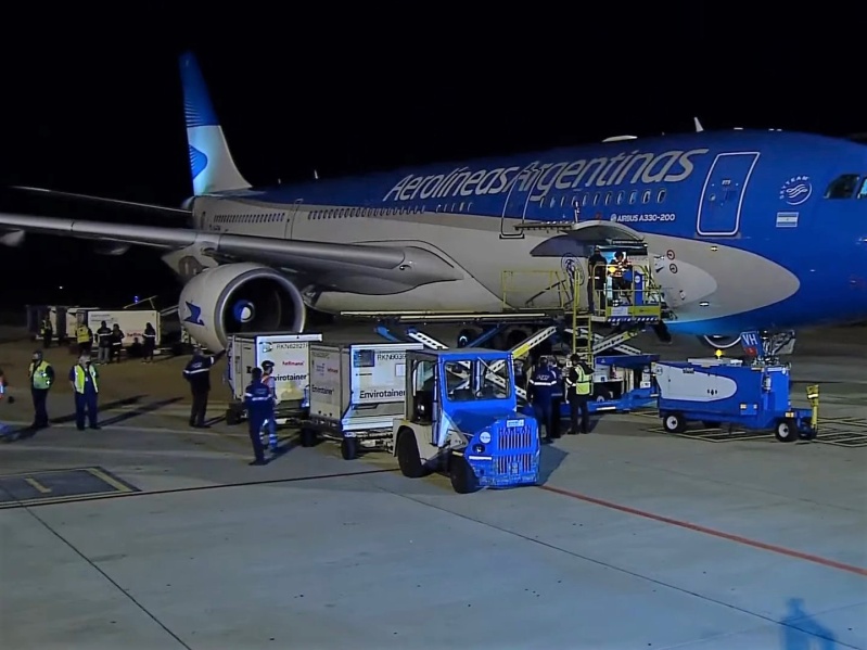 En el Aeropuerto Internacional de Ezeiza, llegó el vuelo 1051 de Aerolíneas Argentinas proveniente de Beijing que trajo un millón de dosis de la vacuna Sinopharm contra el coronavirus Covid-19, completándose así las dos millones que llegaron esta semana. Y allí, el presidente Alberto Fernández recibió el millar de dosis.