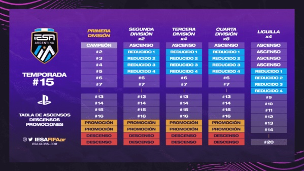 En PS4, cinco divisiones formarán parte de esta temporada. Un grupo de 20 equipos en Primera División, dos en la Segunda, cuatro en Tercera, ocho en Cuarta y cuatro grupos en Liguilla, la divisional creada el año pasado para los clubes nuevos. A su vez, en Xbox habrá dos divisiones de 16 equipos en cada una.
