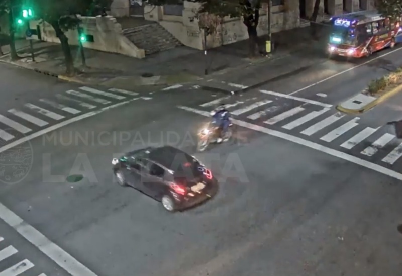 En la intersección de avenida 7 y calle 49, se produjo el choque entre un auto y una motocicleta. El siniestro quedó registrado en las cámaras de seguridad de la Municipalidad de La Plata.