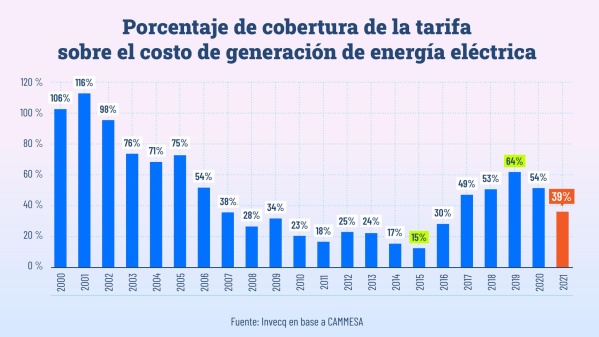 Para tener algunas nociones numéricas: a fines del 2015 los usuarios pagaban solo el 15% del costo de generación de la energía. Con los aumentos de Macri se llegó a un 64% a principios del 2019, momento en que el ex presidente decidió nuevamente congelarlas por motivos electorales. Actualmente, pagamos el 39% de lo que “realmente” cuesta la tarifa de luz.