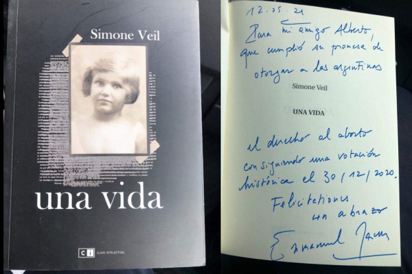 Emmanuel Macron le escribió una dedicatoria en el libro que le regaló a Alberto Fernández luego de almorzar juntos en París, en el Palacio Elíseo. Se trata de una biografía de Simone Veil (Niza, Francia; 13 de julio de 1927-París, Francia; 30 de junio de 2017) que fue una abogada y política francesa sobreviviente del Holocausto que cuando fue ministra legalizó el aborto en el país galo.