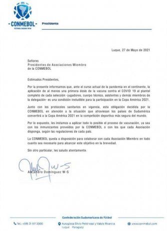 La Confederación Sudamericana de Fútbol emitió un comunicado con el que exige a quienes participarán de la Copa América 2021 la aplicación de al menos una dosis de la vacuna contra el coronavirus.