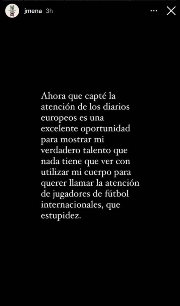 Claro que Jimena se lo tomó con humor, y en sus historias, además de compartir capturas de esas notas, publicó una foto y dijo lo siguiente: "Ahora que capté la atención de los diarios europeos, es una excelente oportunidad para mostrar mi verdadero talento que nada tiene que ver con utilizar mi cuerpo para querer llamar la atención de jugadores de fútbol internacionales. Qué estupidez".