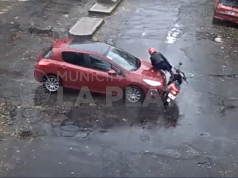 Un auto marca Peugeot, color bordó, chocó a una motociclista que salió despedida e impactó contra el asfalto. El siniestro quedó registrado en las cámaras de seguridad de la Municipalidad de La Plata.