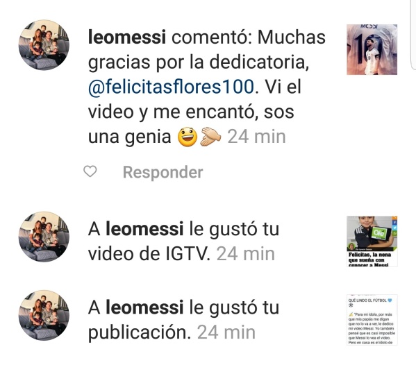 Y aunque no lo creía posible, la respuesta del “10” llegó. Lionel Messi contestó su video en Instagram y le agradeció: “Muchas gracias por la dedicatoria. Vi el video y me encantó, sos una genia”, comentó el capitán de la selección Argentina.