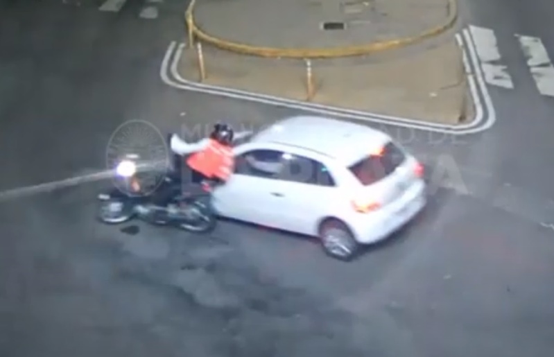 En las últimas horas, un automovilista chocó a un repartidor que circulaba en moto por el centro de la ciudad. El siniestro quedó registrado en las cámaras de seguridad de la Municipalidad de La Plata.
