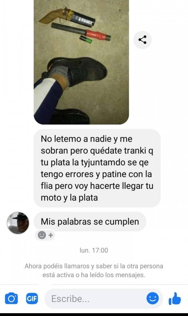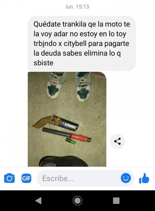 "Eliminá lo que subiste", le dijo el estafador y le envió una foto de un arma tumbera para amenazarla. Y no se quedó ahí, sino que luego le dijo que "no le temo a nadie y me sobran".