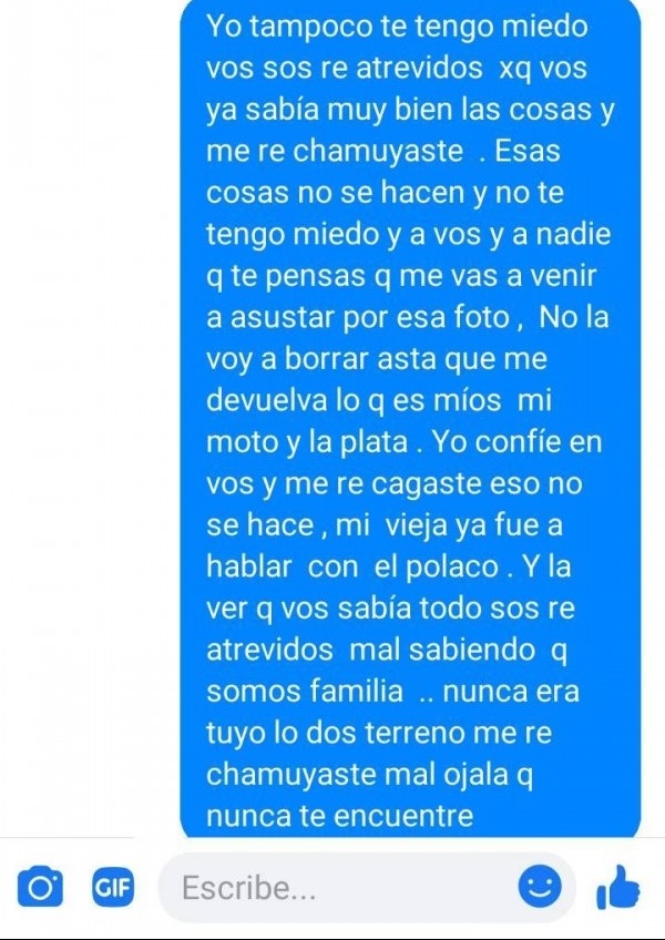Ella le respondió a sus amenazas por redes sociales y se arrepintió de haber confiado en su propia familia. Hoy sigue esperando que le devuelvan, aunque sea, el dinero que gastó en un terreno.