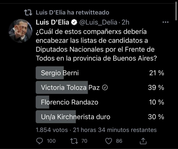 "¿Cuál de estos compañerxs debería encabezar las listas de candidatos a Diputados Nacionales por el Frente de Todos en la provincia de Buenos Aires?", preguntó D'elia en una encuesta de Twitter y dejó como opciones: Sergio Berni, Victoria Tolosa Paz, Florencio Randazzo o un kirchnerista duro.