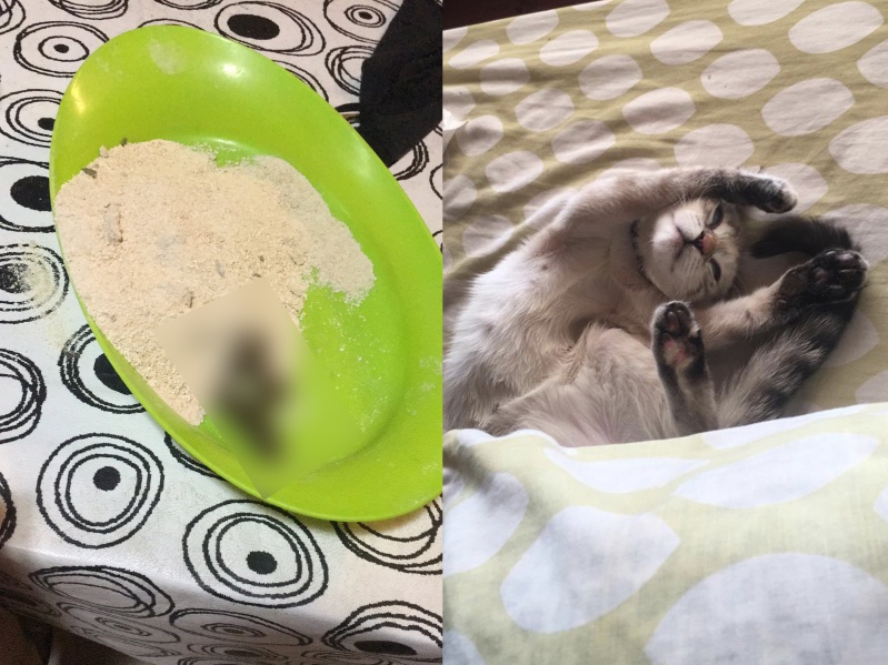 Tomás compartió en Twitter la foto de una fuente con pan rallado, que tenía excremento de su gato, seguido de una imagen de su mascota viendo escondido.
