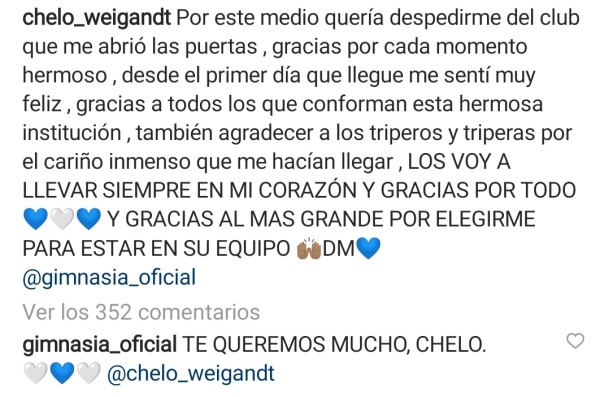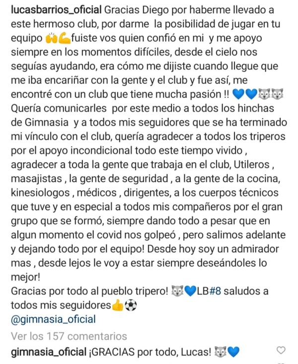 Quería comunicarles por este medio a todos los hinchas de Gimnasia y a todos mis seguidores que se ha terminado mí vínculo con el club. Quería agradecer a todos los triperos por el apoyo incondicional todo este tiempo vivido. Agradecer a toda la gente que trabaja en el club: utileros, masajistas, la gente de seguridad, a la gente de cocina, kinesiólogos, médicos, dirigentes, a los cuerpos técnicos que tuve y en especial a todos mis compañeros por el gran grupo que se formó. Siempre dando todo a pesar que en algún momento el covid nos golpeó, pero salimos adelante y dejando todo por el equipo! Desde hoy soy un admirador más, desde lejos le voy a estar siempre deseándoles lo mejor! Gracias por todo al pueblo tripero!