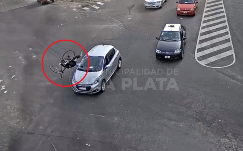 Un nuevo siniestro vial fue protagonizado por un auto y una bicicleta en el casco urbano de la ciudad. El accidente quedó registrado en las cámaras de seguridad de la Municipalidad de La Plata.