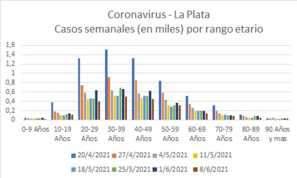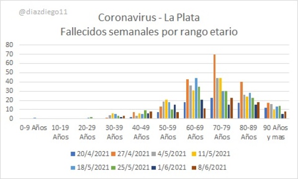 En cuanto a los fallecidos, la distribución es más heterogénea. Por ejemplo, la franja de 40-49 años, y la de 70-79 y 80-89 evidenciaron un crecimiento de muertos en la última semana. Sin embargo, existió una caída bastante pronunciada de los fallecidos en las franjas intermedias: de 50 a 59 años, y de 60 a 69 años.