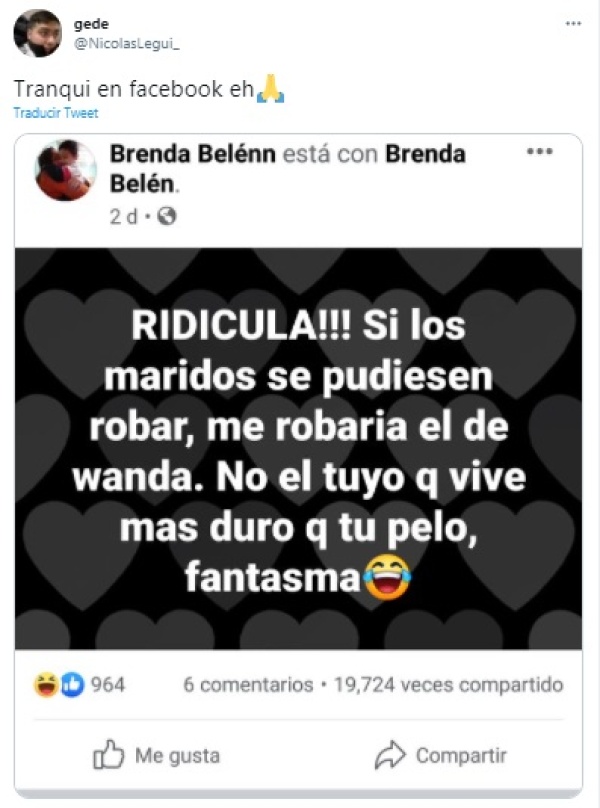 “Si los maridos se pudiesen robar, me robaría el de Wanda. No el tuyo que vive más duro que tu pelo, fantasma”, disparó Brenda.