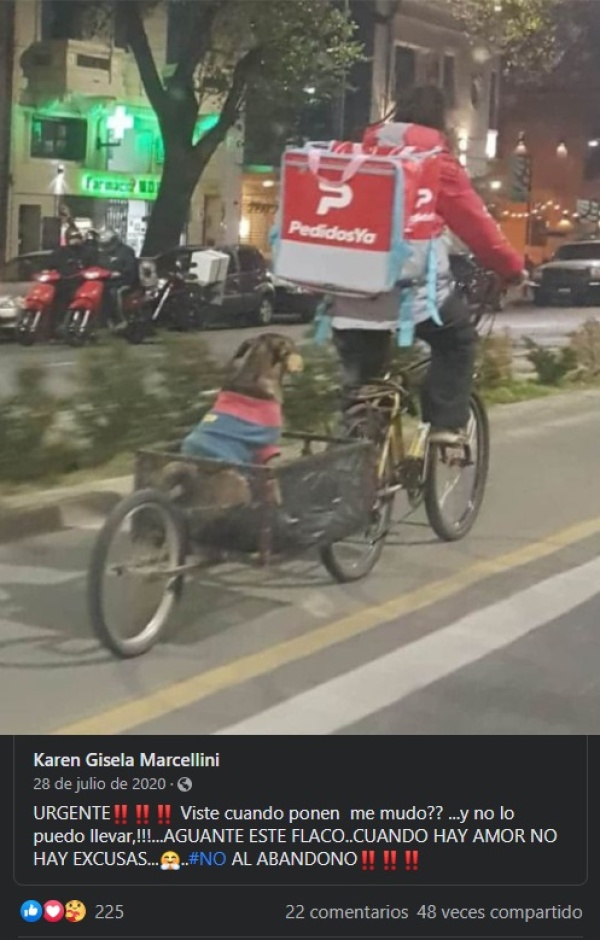 En la misma se ve a un repartidor cumpliendo con su trabajo pero con un acompañante particular, su perro. Al no poder dejar sólo a su mascota ni al cuidado de nadie, el joven decidió modificar su bicicleta para que éste lo acompañe pedido tras pedido.