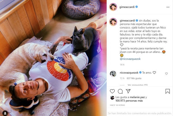 Junto a una tierna postal que lo tiene como protagonista a Nicolás, Gime sumó algo de humor para finalizar la publicación, tal y como tiene acostumbrados a sus fanáticos: “Pasá la receta para mantenerte tan jóven con 44 porque es un afano…”. A inicios de este mes, la reconocida pareja tomó rumbo a Estados Unidos por trabajo y aprovechan su estadía allí para celebrar el cumpleaños del actor.