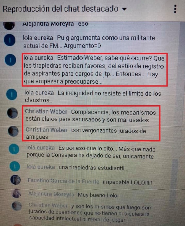 En otro pasaje, la propia Puig sacó una captura de pantalla donde varios docentes y directivos (entre ellos Weber) sugerían que había ascendido por “acomodo” y “favores”.