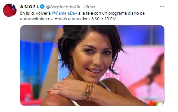 Ahora, el periodista Ángel de Brito confirmó en su cuenta de Twitter que el regreso de Pamela sería el mes que viene: "En julio, volvería @PamelaDav  a la tele con un programa diario de entretenimientos. Horarios tentativos 8.30 o 10 PM".