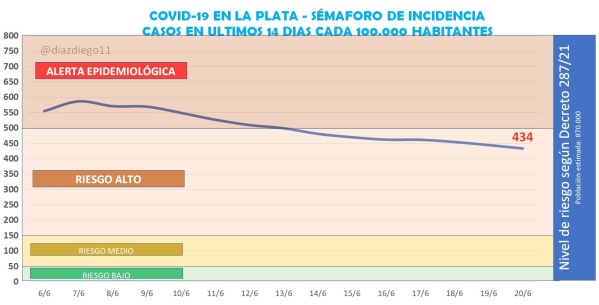 Sin embargo, todavía La Plata aparece lejos de esa posibilidad. Tiene 434 casos, según el semáforo de incidencia epidemiológica de contagios de los últimos 14 días cada 100 mil habitantes. Para pasar a riesgo medio debería perforar los 150 casos. Todavía parece lejano.