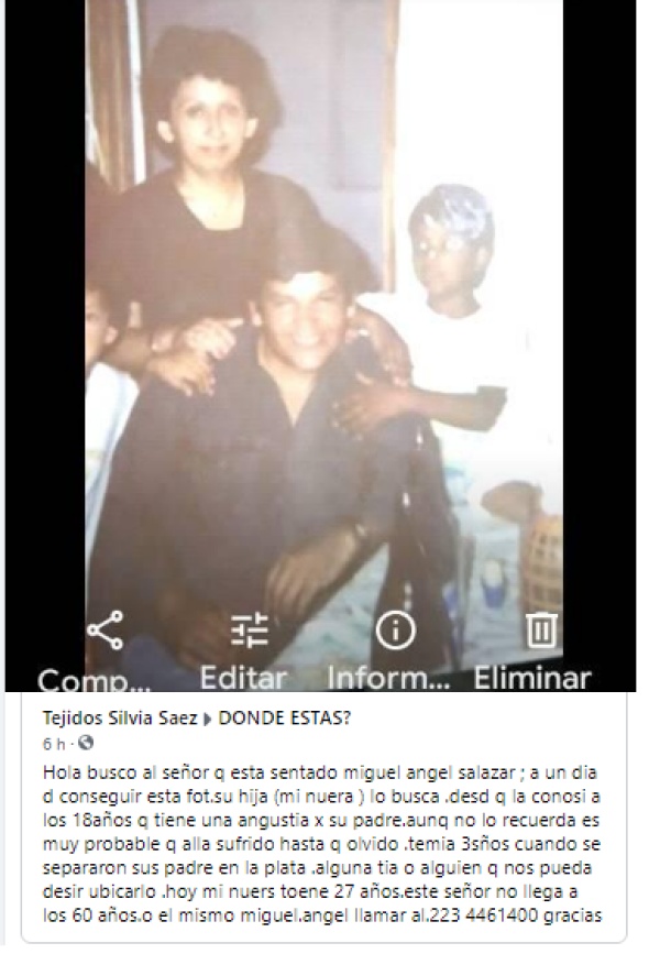 "Hola... busco al señor q está sentado, Miguel Ángel Salazar. A un día de conseguir esta foto, su su hija (mi nuera ) lo busca. Desde que la conocí a los 18 años que tiene una angustia x su padre. Aunque no lo recuerda, es muy probable q haya sufrido hasta que olvidó. Tenía 3 años cuando se separaron sus padres en La Plata. ¿Alguna tía o alguien que nos pueda decir dónde ubicarlo? Hoy mi nuera tiene 27 años, este  señor no llega a los 60 años. O el mismo Miguel. Llamar al 223 4461400, gracias".