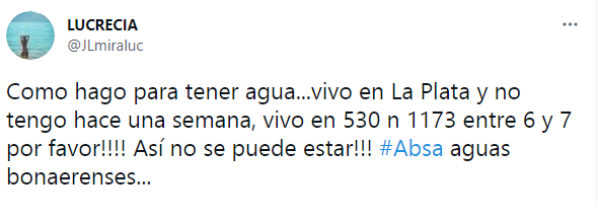 En las últimas horas, Lucrecia, una platense que vive en Tolosa, manifestó su indignación porque según contó, hace una semana no tiene agua.