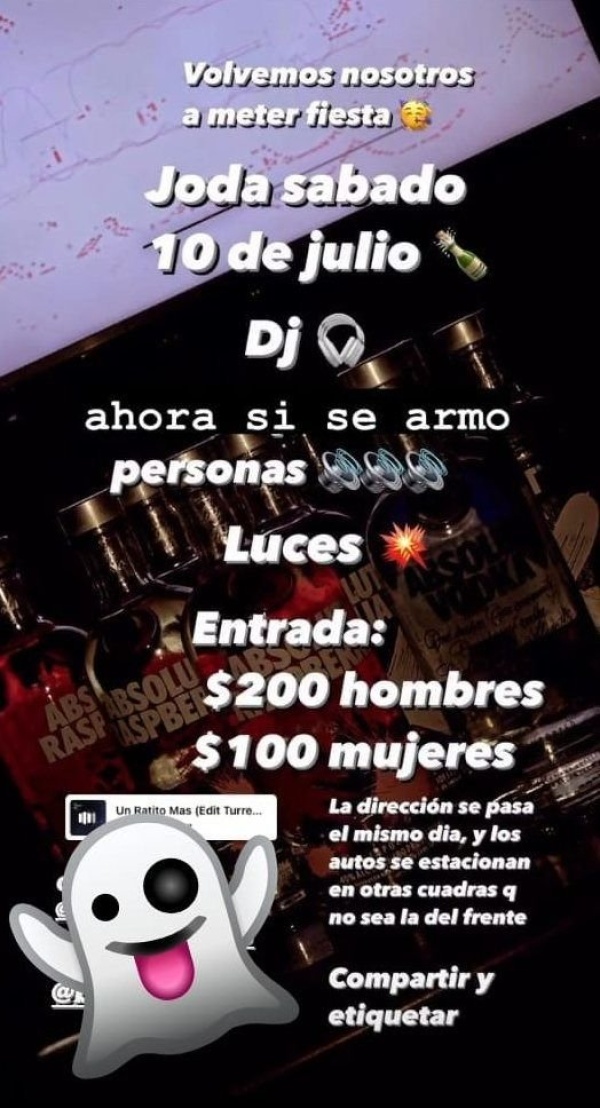En esta oportunidad, corrió por Instagram un flayer donde una persona anunciaba la organización de un festejo el próximo sábado 10 de julio. "Volvemos nosotros a meter fiesta, ahora sí se armó", decía la foto informativa indicando que la misma se haría con presencia de DJ, sonido e iluminación, y pasando los precios de las entradas en las que hacen diferencia a hombres de mujeres.