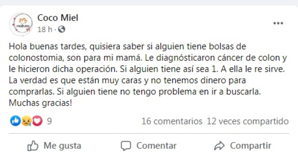 Según contó, fue intervenida quirúrgicamente luego de haber sido diagnosticada con cáncer de cólon. Es por eso que ahora precisan bolsas de colostomía, que rondan en los 5 mil pesos.
