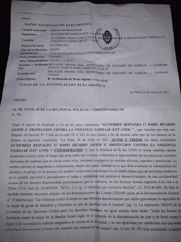Ante esta situación, su esposa le comentó a LAPLATA1.com que “hace dos semanas atrás la madre y el hermanastro lo sacaron a la fuerza a mi esposo, le hicieron una perimetral y exclusión de hogar. Nosotros vivimos delante del terreno, y la madre atrás. Desde ese día estamos sufriendo y me quede sola en mi casa con mis tres nenas. Sufrimos agresiones, me maltratan, insultan, cortan la luz y agregaron que nos van a prender fuego la casa con las nenas adentro”.