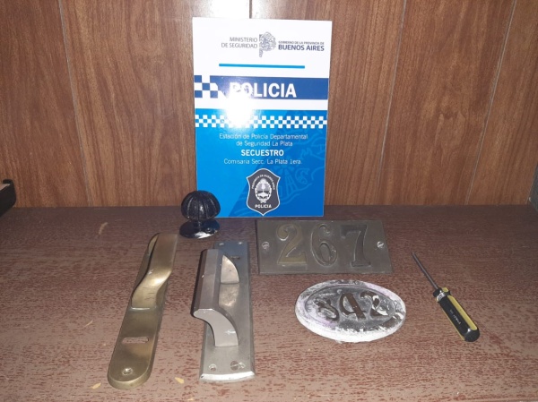 El sujeto fue arrestado por personal de la Comisaría 1° en 13 esquina 49 y en su poder secuestraron una mochila con tres herrajes de puestas de la zona, dos placas numéricas y un destornillador Phillips.