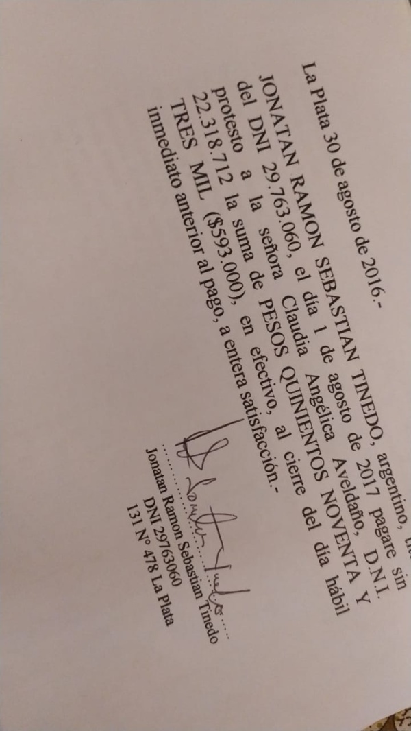 Tiempo después de acusarlo, Tinedo le reconoce la culpabilidad y le promete devolver cada centavo en el período de un año. Todo, bajo la custodia de un abogado quien lo obligó a firmar un convenio. “No sólo no cumplió sino que aprovechó esa situación para volver a mi vida”, le contaba Claudia a LAPLATA1.com.