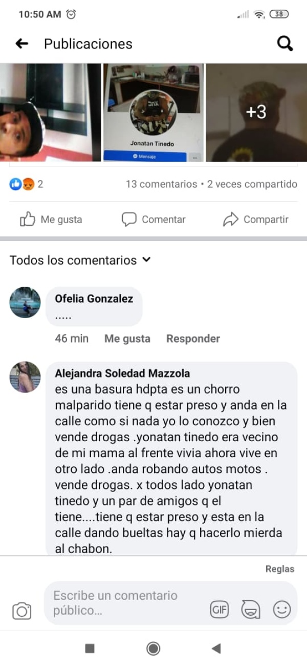 Ya con pruebas tanto con capturas como con audios de él aceptando sus comportamientos, Claudia lo denunció, pero al parecer Tinedo es amigo del poder, “Tiene contactos con policías y políticos, y como la denuncia no alcanzó, decidí escracharlo públicamente”. Tras esto, el implicado llamó a un reconocido canal nacional y actuó victimizándose y acusando a Claudia de haberlo querido matar a balazos, “fue todo un acting, un psicópata manipulador, hasta el hermano me amenazó”, dijo.