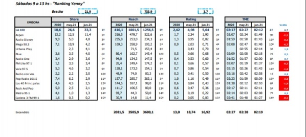 Ranking Yenny, transmitido los sábados de 9 a 13 horas por La 100, hizo en promedio 33,3 puntos de rating durante el mes pasado, superando por 22 puntos al segundo lugar, perteneciente a Radio Aspen.